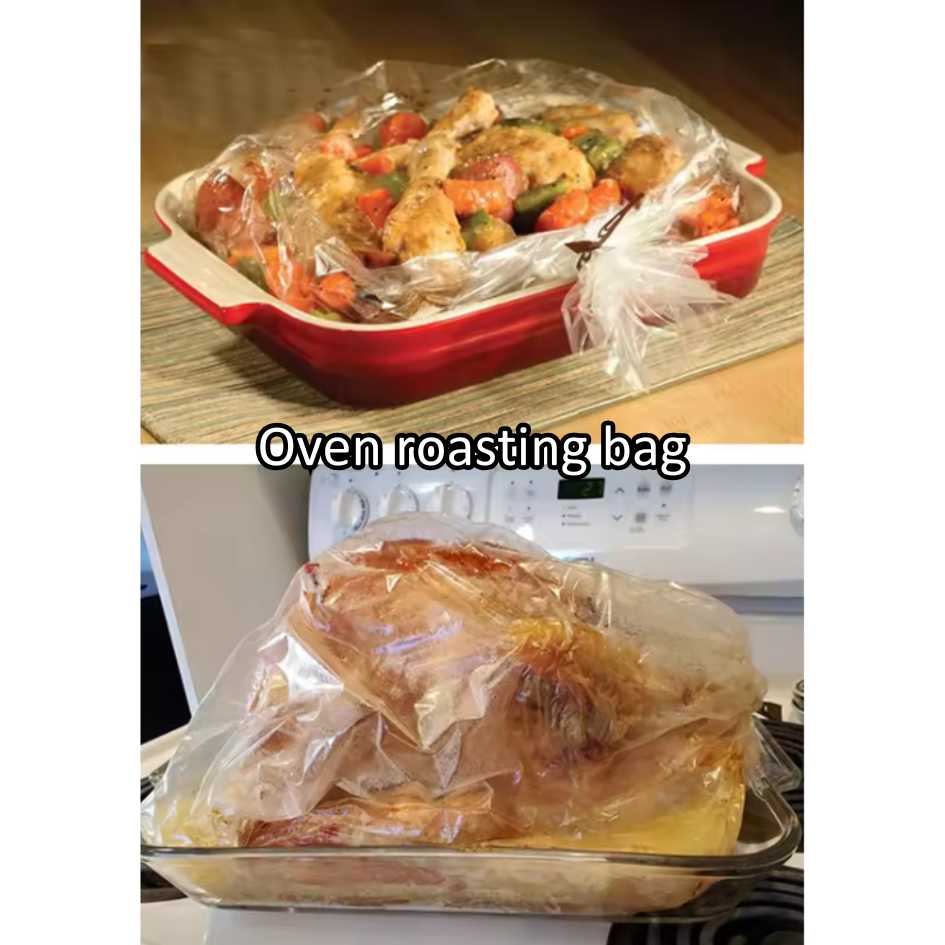 An oven-safe, food-grade roasting bag designed for cooking whole chicken or turkey evenly and efficiently. It traps heat and moisture inside the bag, keeping the meat juicy, tender, and flavorful while reducing splatter and oven mess.