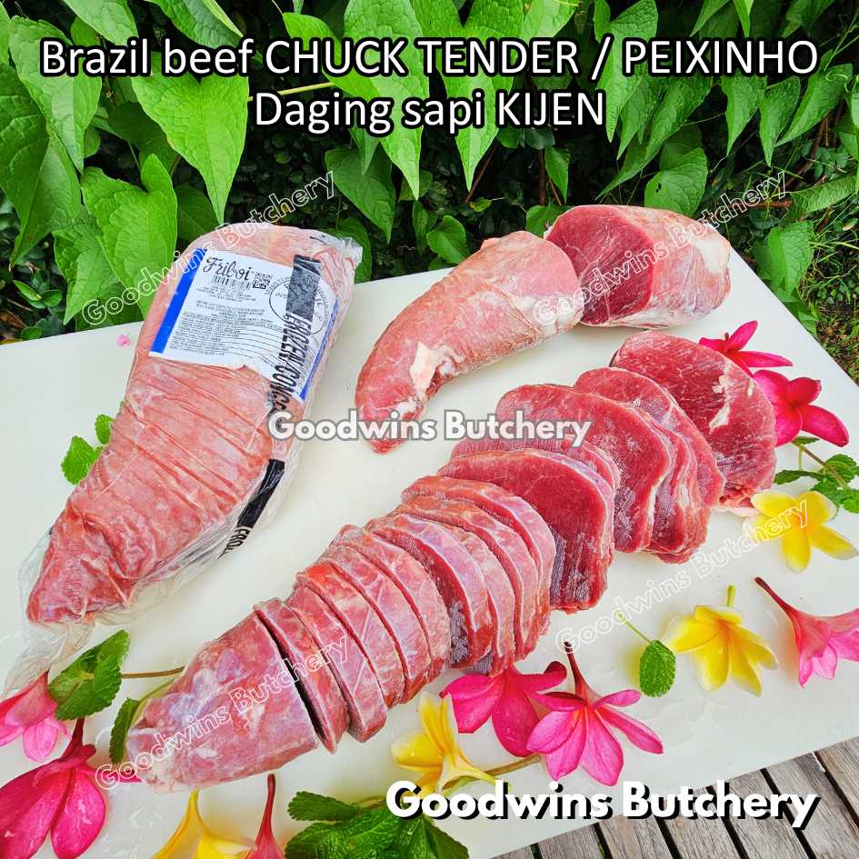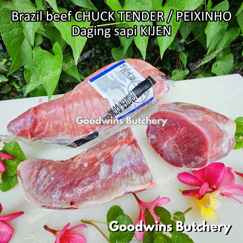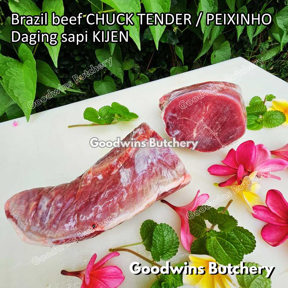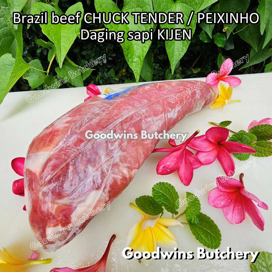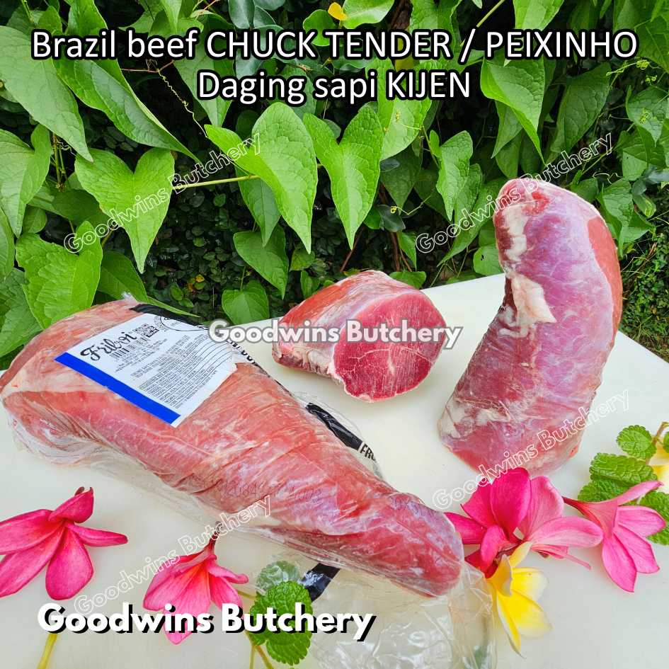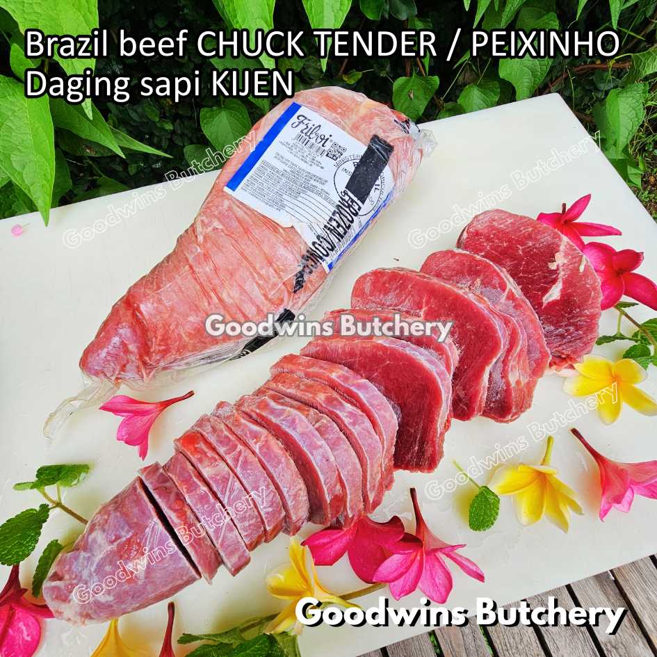 DAGING SAPI KIJEN (beef chuck tender / peixinho) adalah potongan daging sapi lean / nyaris tanpa lemak berbentuk silindris yang berasal dari bagian pundak (chuck). Meskipun namanya mengandung kata “tender / empuk,” tingkat keempukannya tidak setara dengan bagian loin, namun potongan ini tetap memiliki rasa daging yang kuat, serbaguna, dan sangat lezat jika dimasak dengan teknik yang tepat. Bentuknya menyerupai tenderloin versi kecil, sehingga cocok untuk diiris, dipanggang, atau dimasak perlahan.