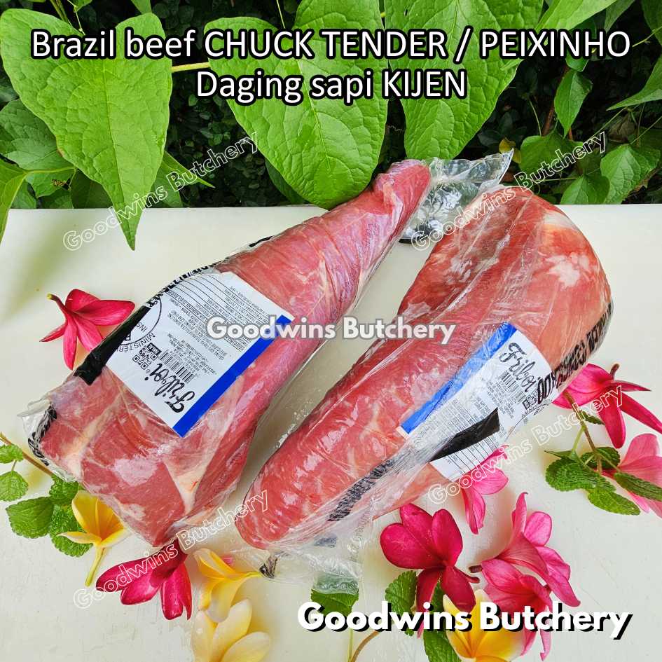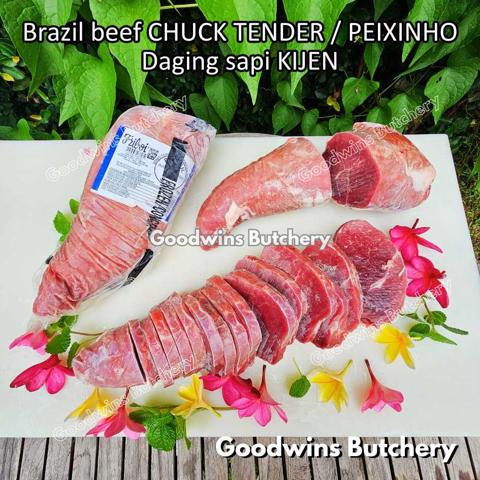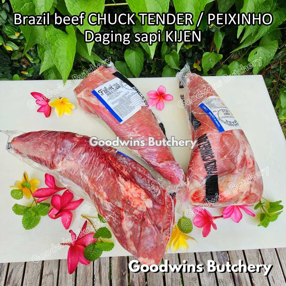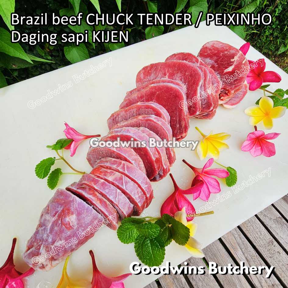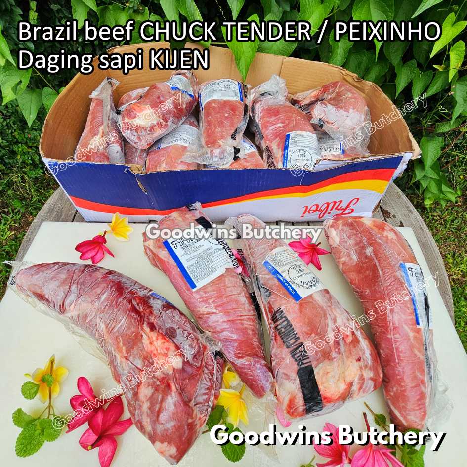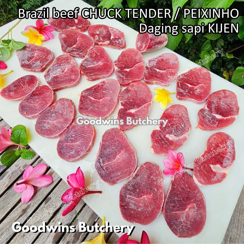 DAGING SAPI KIJEN (beef chuck tender / peixinho) adalah potongan daging sapi lean / nyaris tanpa lemak berbentuk silindris yang berasal dari bagian pundak (chuck). Meskipun namanya mengandung kata “tender / empuk,” tingkat keempukannya tidak setara dengan bagian loin, namun potongan ini tetap memiliki rasa daging yang kuat, serbaguna, dan sangat lezat jika dimasak dengan teknik yang tepat. Bentuknya menyerupai tenderloin versi kecil, sehingga cocok untuk diiris, dipanggang, atau dimasak perlahan.