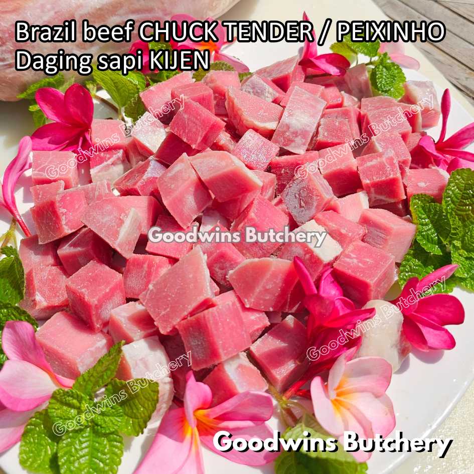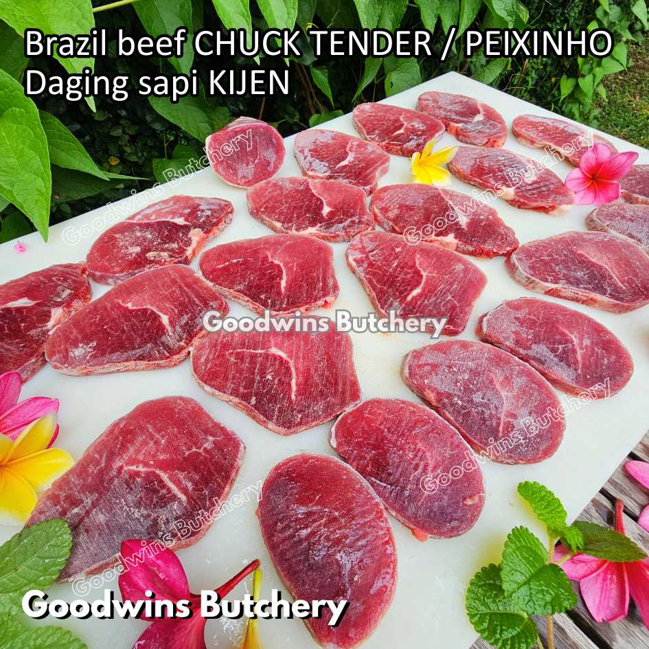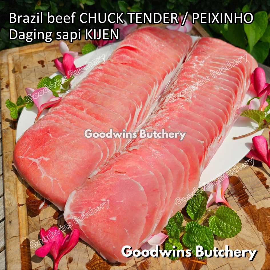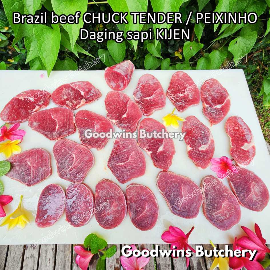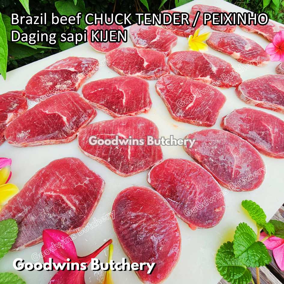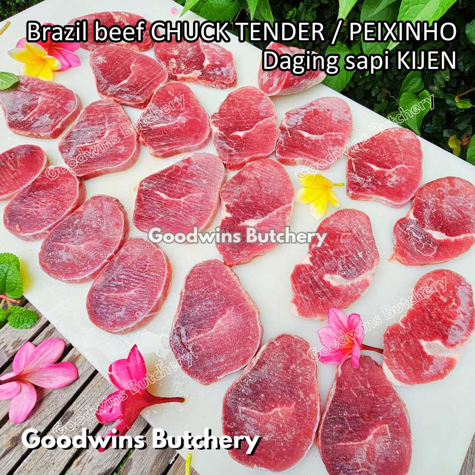 DAGING SAPI KIJEN (beef chuck tender / peixinho) adalah potongan daging sapi lean / nyaris tanpa lemak berbentuk silindris yang berasal dari bagian pundak (chuck). Meskipun namanya mengandung kata “tender / empuk,” tingkat keempukannya tidak setara dengan bagian loin, namun potongan ini tetap memiliki rasa daging yang kuat, serbaguna, dan sangat lezat jika dimasak dengan teknik yang tepat. Bentuknya menyerupai tenderloin versi kecil, sehingga cocok untuk diiris, dipanggang, atau dimasak perlahan.