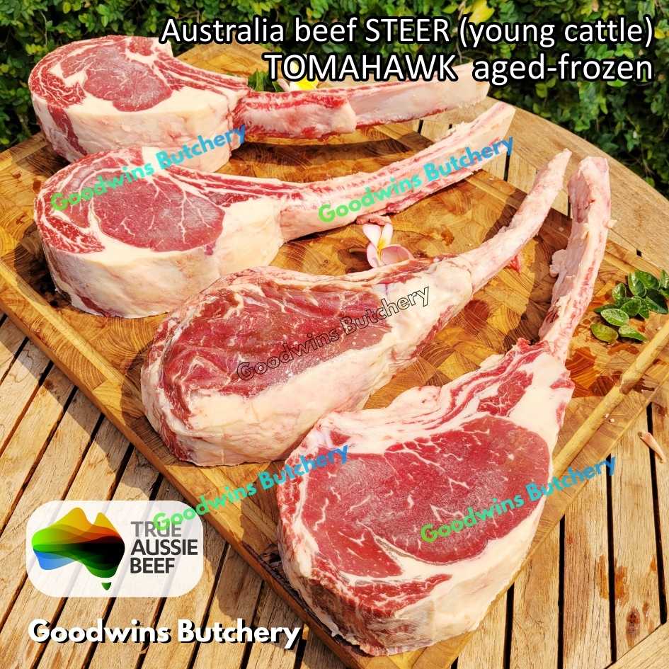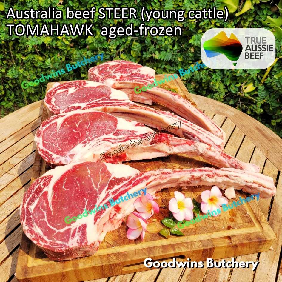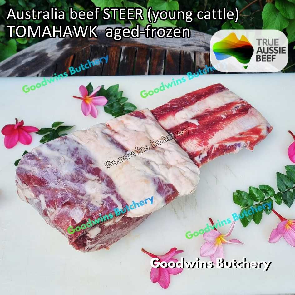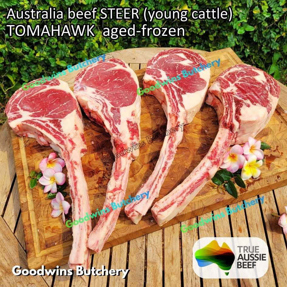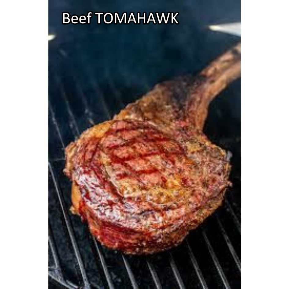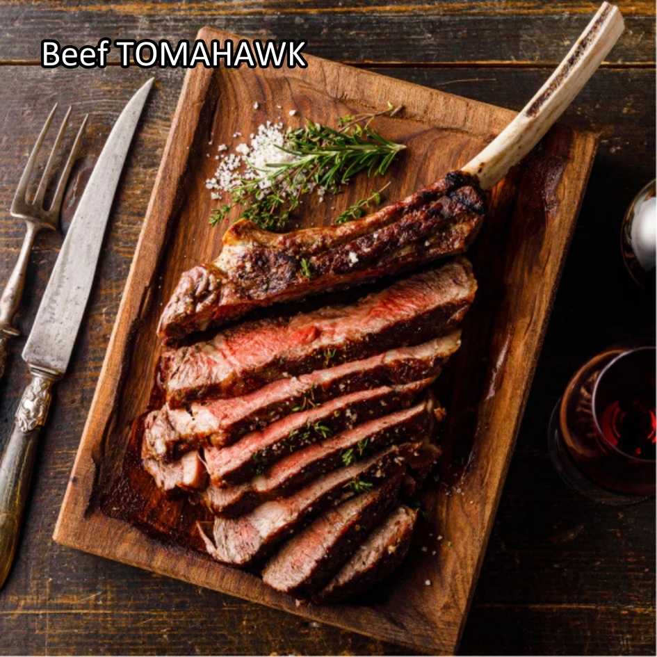BEEF TOMAHAWK adalah steak premium ribeye bertulang dengan ciri khas tulang iga yang panjang, menyerupai bentuk kapak tomahawk. Potongan ini dikenal karena tampilannya yang spektakuler serta cita rasa daging yang kaya dan juicy.