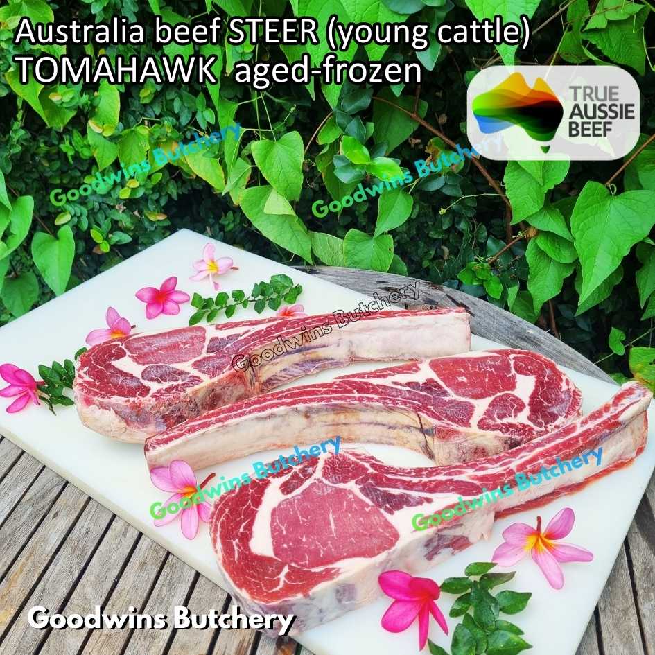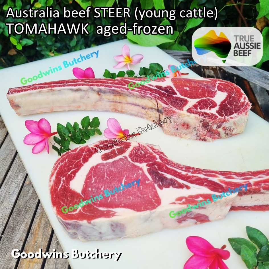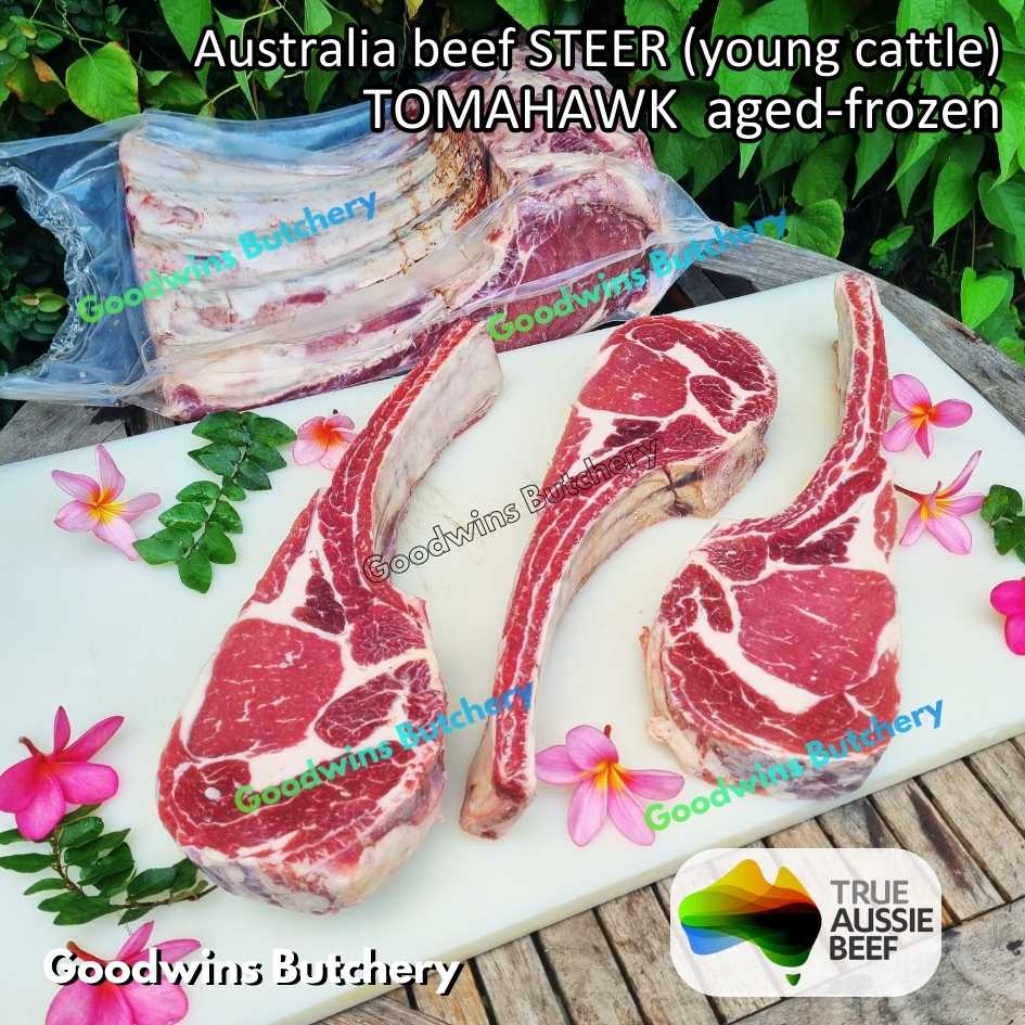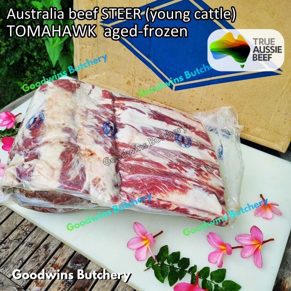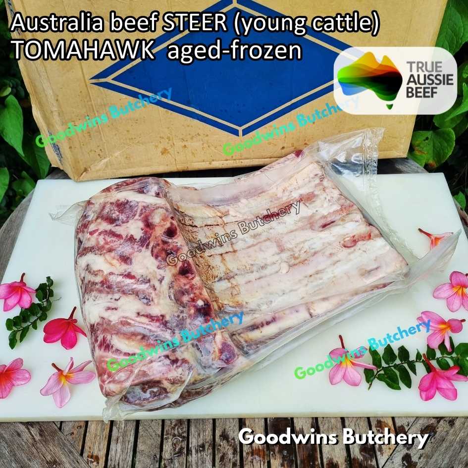 BEEF TOMAHAWK adalah steak premium ribeye bertulang dengan ciri khas tulang iga yang panjang, menyerupai bentuk kapak tomahawk. Potongan ini dikenal karena tampilannya yang spektakuler serta cita rasa daging yang kaya dan juicy.