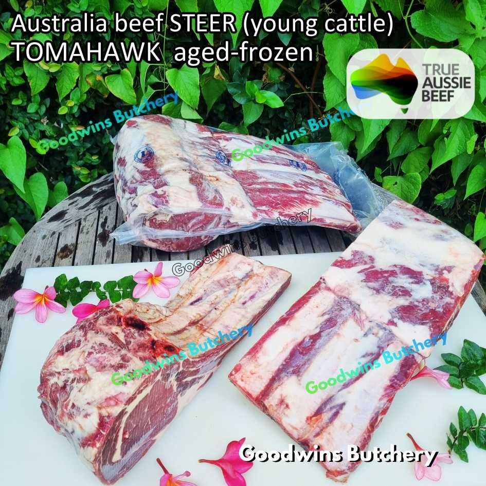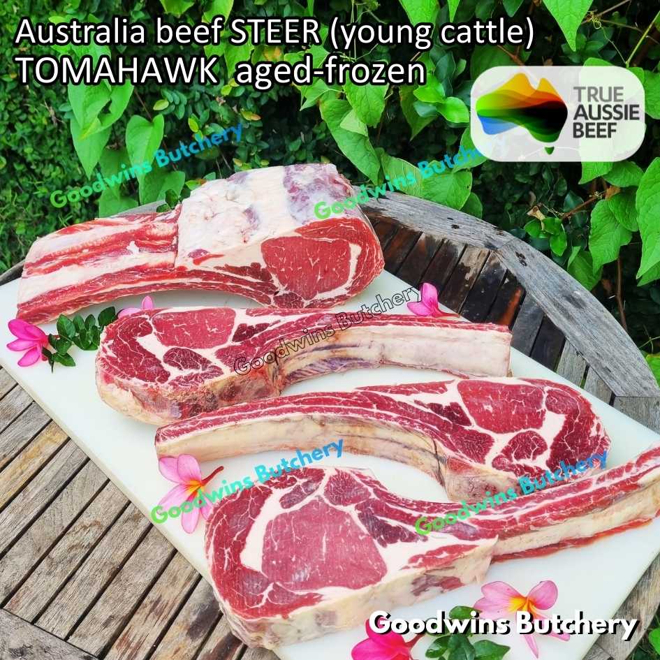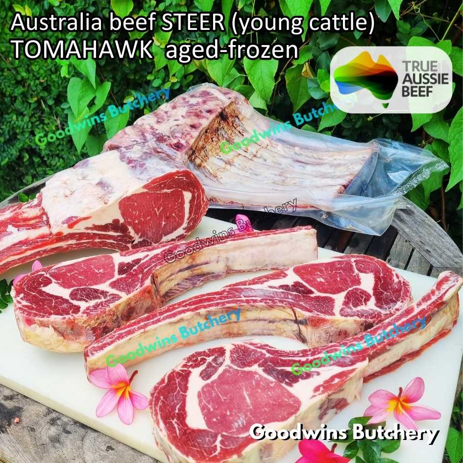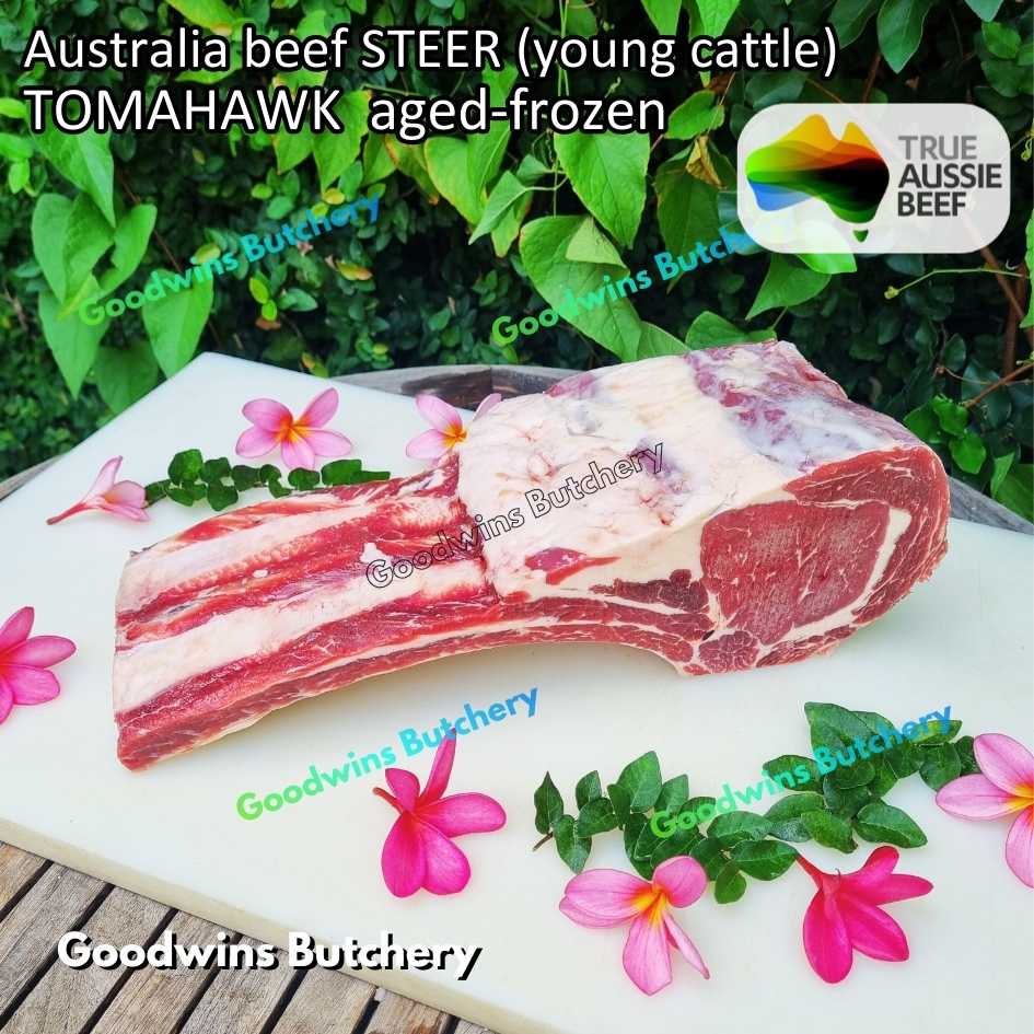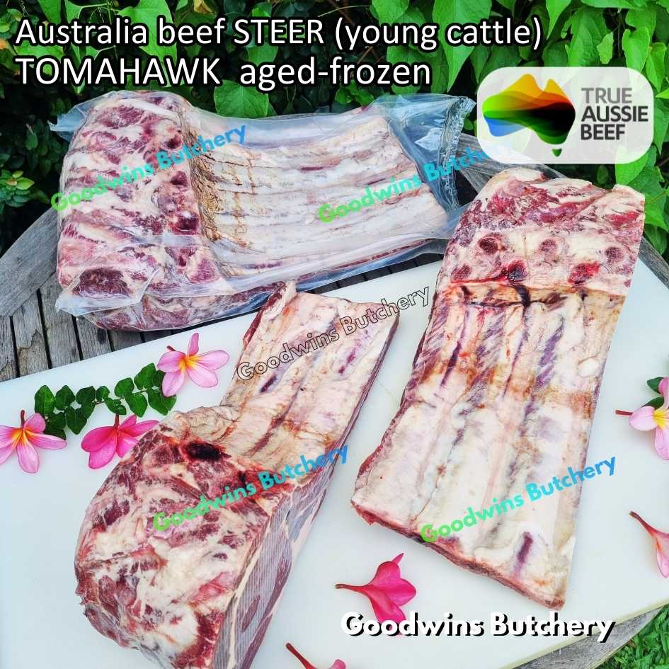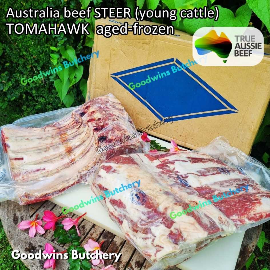 BEEF TOMAHAWK adalah steak premium ribeye bertulang dengan ciri khas tulang iga yang panjang, menyerupai bentuk kapak tomahawk. Potongan ini dikenal karena tampilannya yang spektakuler serta cita rasa daging yang kaya dan juicy.