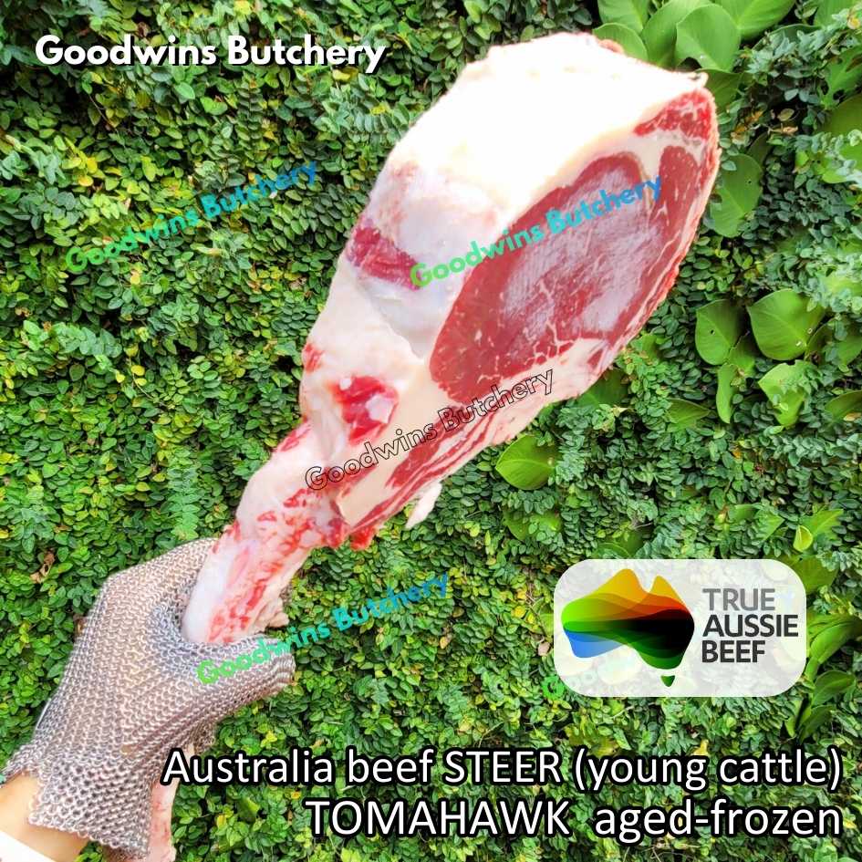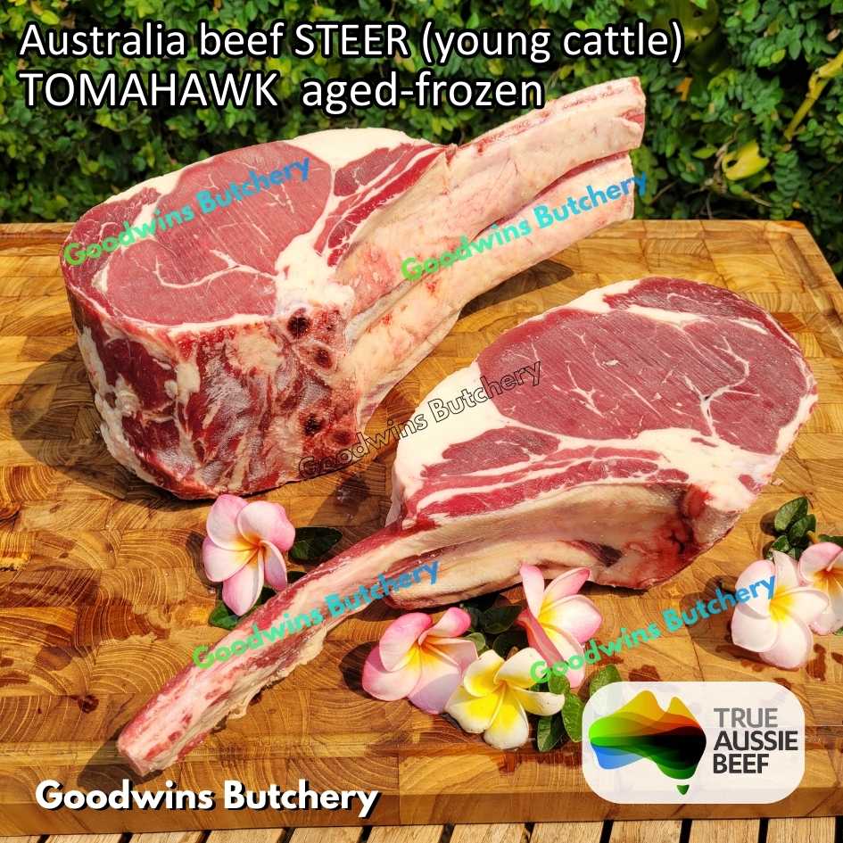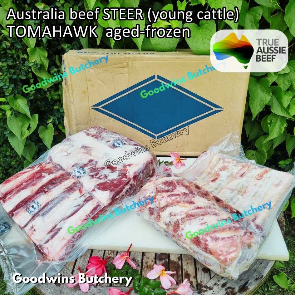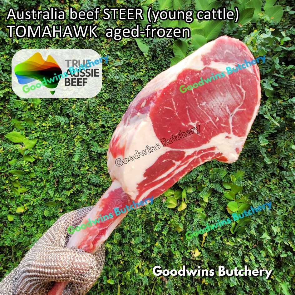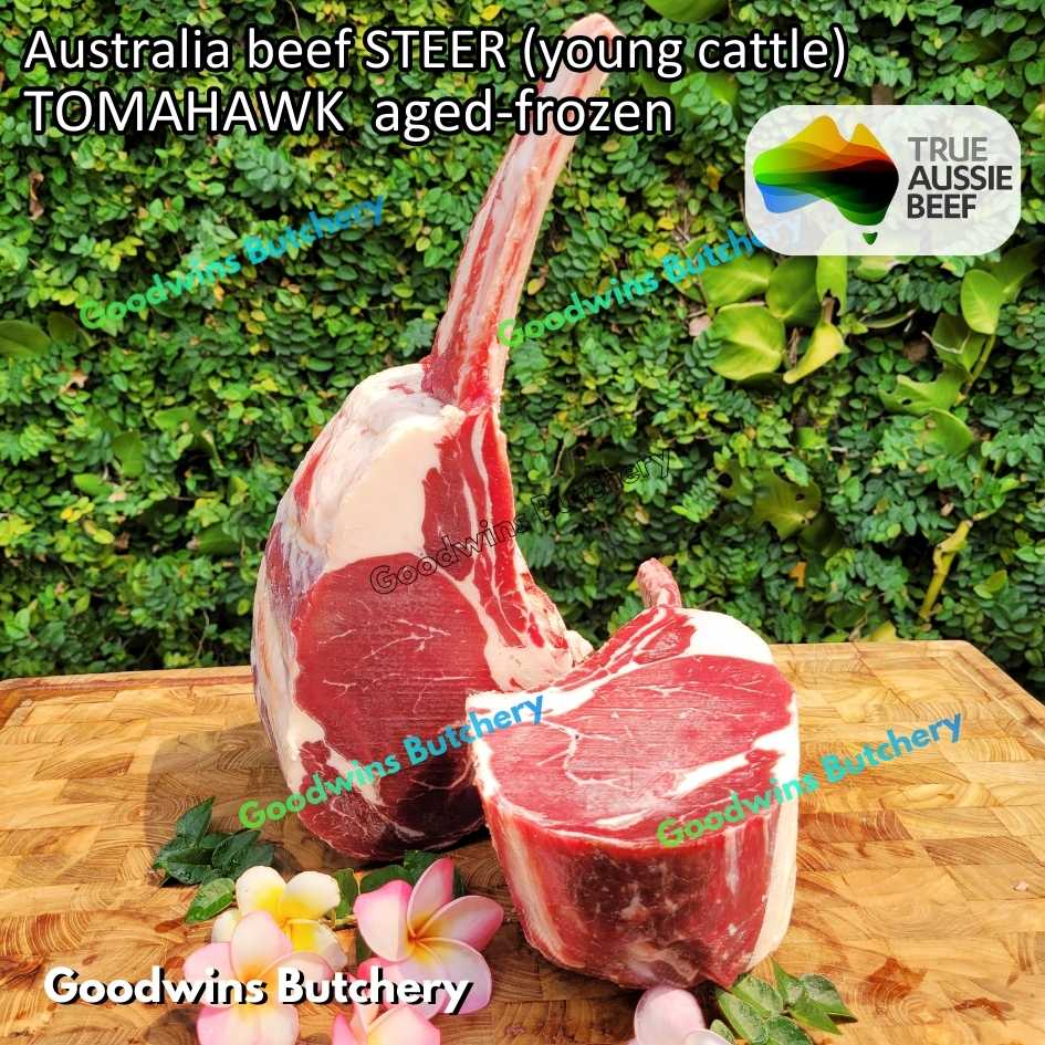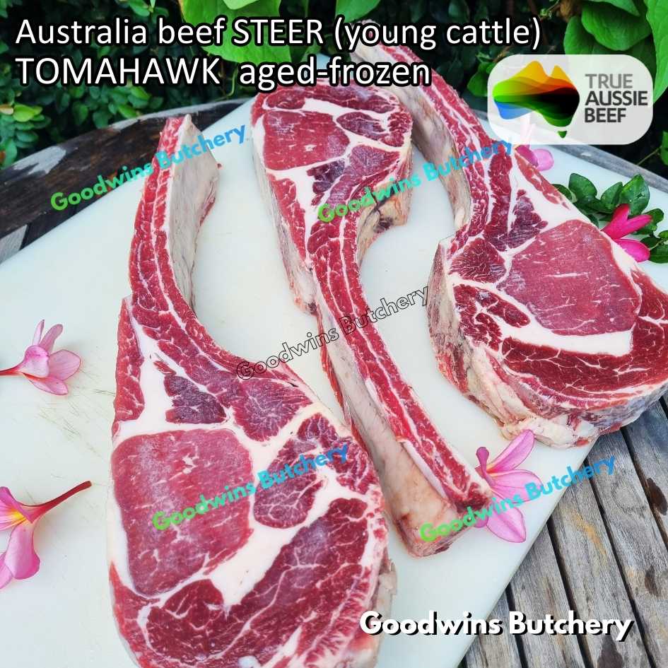 BEEF TOMAHAWK adalah steak premium ribeye bertulang dengan ciri khas tulang iga yang panjang, menyerupai bentuk kapak tomahawk. Potongan ini dikenal karena tampilannya yang spektakuler serta cita rasa daging yang kaya dan juicy.